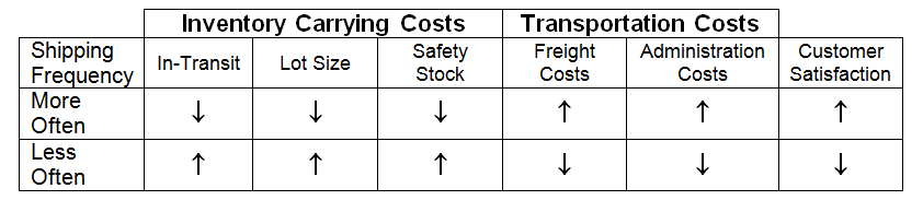 Shipping frequencies are a primary determining factor of total transportation costs, inventory carrying costs, transportation administration costs, and customer satisfaction. If we ship less material more frequently (Figure 1) – (1) overall in-transit, lot quantity, and safety stock inventory levels and costs are reduced because there is typically less inventory in-transit at any one time, the recipient is receiving smaller lot quantities, and there are more opportunities to react to shifts in demand or supply streams, (2) transportation administration costs are greater because we have to incur the one-time expense of setting up a shipment for its accompanying paperwork and loading more often, (3) transportation costs are typically higher since we are moving smaller volumes per shipment and not benefiting from transportation discounts associated with large loads, and