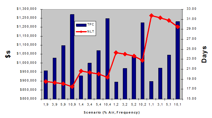 In the analysis we considered sixteen shipping scenarios represented by (x,y) pairs where x represents the % shipping by air and y the number of shipments per month. We considered 1%, 3%, 5%, and 10% shipping via air, and 9, 4, 2, and 1 shipments per month to each country in the Asia-Pacific. The analysis compares the total logistics cost (inventory carrying and transportation) of each scenario with the door-to-door delivery cycle times experienced by the countries in the Asia-Pacific. Since the customers in the Asia-Pacific were not willing for their lead times to exceed 24 days, the recommended solution was the scenario yielding the lowest total logistics cost with net lead times less than 24 days. In this case that shipment solution was to ship 1% via air four times per month.